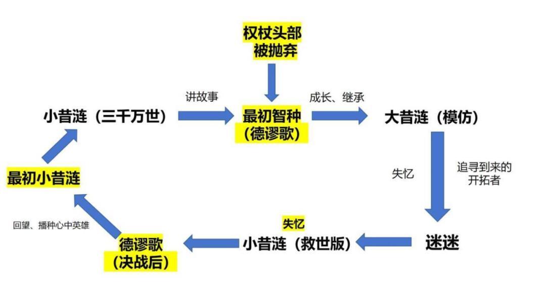 《崩鐵》的編劇通過對記憶元素的重點刻畫,將各種形態、階段的昔漣完美地串聯成爲一個人,並將翁法羅斯劇情中不少重要的伏筆一一進行了回收。比如在之前劇情裏的每個記憶星神的瞥視,實際上都是被未來的德謬歌,也就是昔漣自己的回望,給過去的自己留下神諭,才能憑藉着一絲希望熬過三千萬次輪迴的孤獨,將記憶播種給最初的自己——翁法羅斯之心德謬歌。