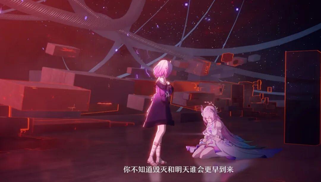 而且,《崩鐵》在對記憶主題的探討上還是留給了玩家足夠的想象空間和餘地。比如在昔漣的角色PV《再度和你》中,就採用了大小昔漣分開敘事的方式,最終德謬歌在昔漣的鼓勵下邁向了明天。你可以當作是昔漣自我的對話,也可以解讀成兩個不同昔漣的互相成就。