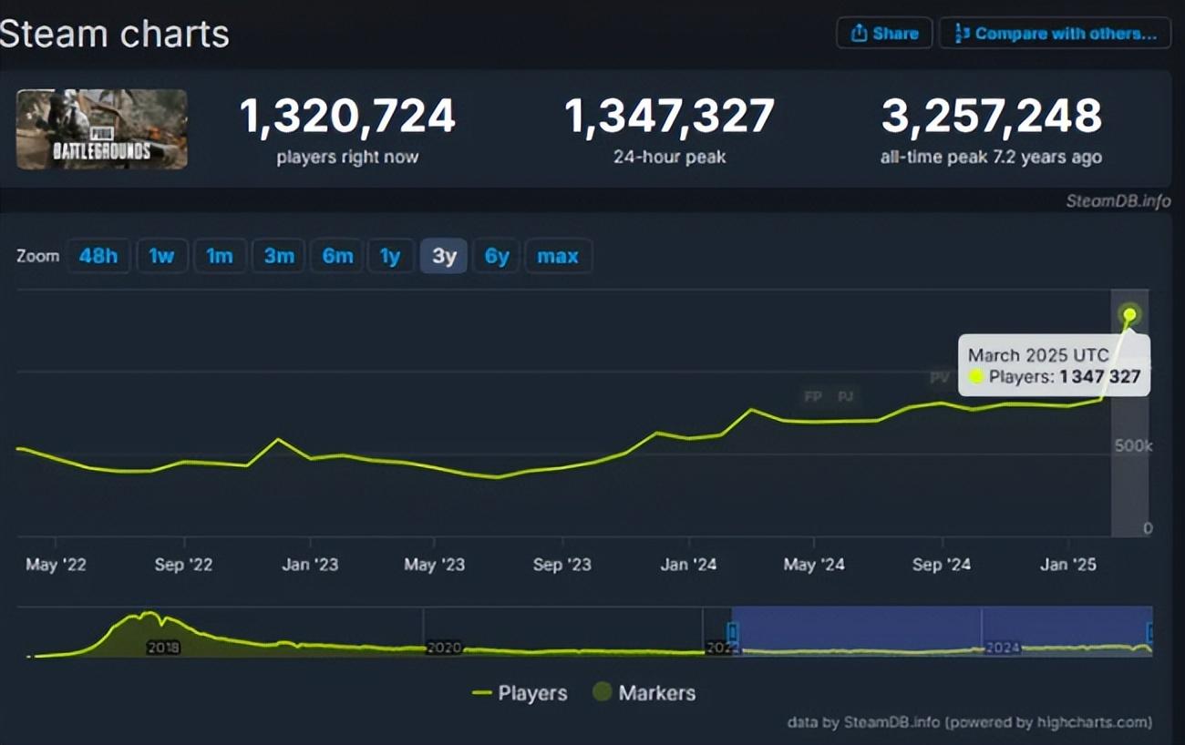 雖然當年總被調侃,外掛多、要涼,但實際上,PUBG一直保持着相當強的生命力。2022年轉免費後,PUBG的運營數據節節攀升,甚至在今年3月的時候達到了134萬Steam同時在線的近年新高。