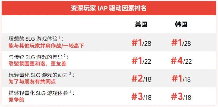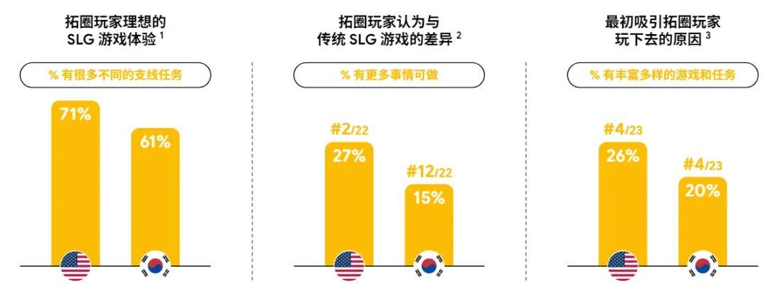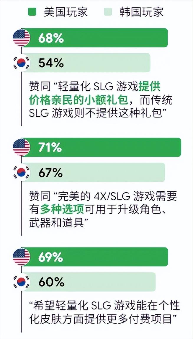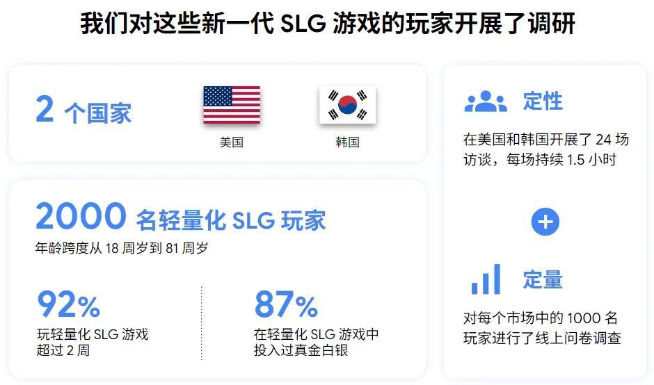 Google的報告基本可解答疑惑。其調研樣本源爲來自美國、韓國的總計2000名輕量化SLG玩家,其中絕大部分在遊戲裏花過錢。這兩個國家亦是SLG出海重點市場,前者是在全球發行SLG收入佔比最高的地區,後者則是用戶對SLG認知最成熟的地區之一。