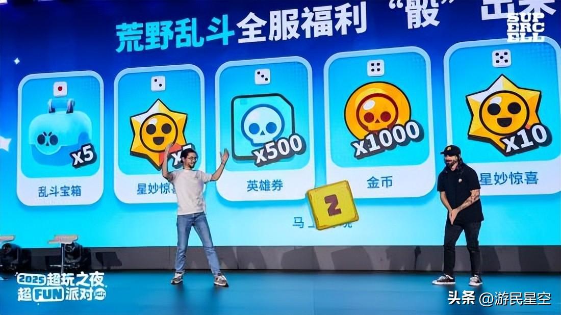 《荒野亂鬥》的福利由主創Dani和Marzio親手擲骰決定。第一次,骰子定格在“3”,現場響起一片鼓勵的掌聲。Dani與Marzio相視一笑,毫不猶豫地撿起骰子:“One more time!(再來一次!)”第二次、第三次……現場的期待感被徹底拉滿。直到第四次,當骰子翻滾後亮出最大的“6”點時,全場瞬間爆發出雷鳴般的歡呼與尖叫,這份“爭”取來的頂級福利,讓幸福感加倍。