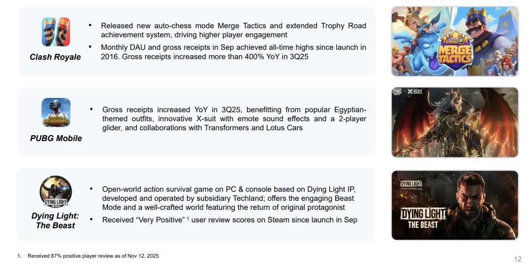 在中國市場,我們的幾款核心射擊遊戲——包括《三角洲行動》《無畏契約》《和平精英》《暗區突圍》《穿越火線》手遊——在2025年都保持了健康增長,無論是日活躍用戶還是收入都在提升。