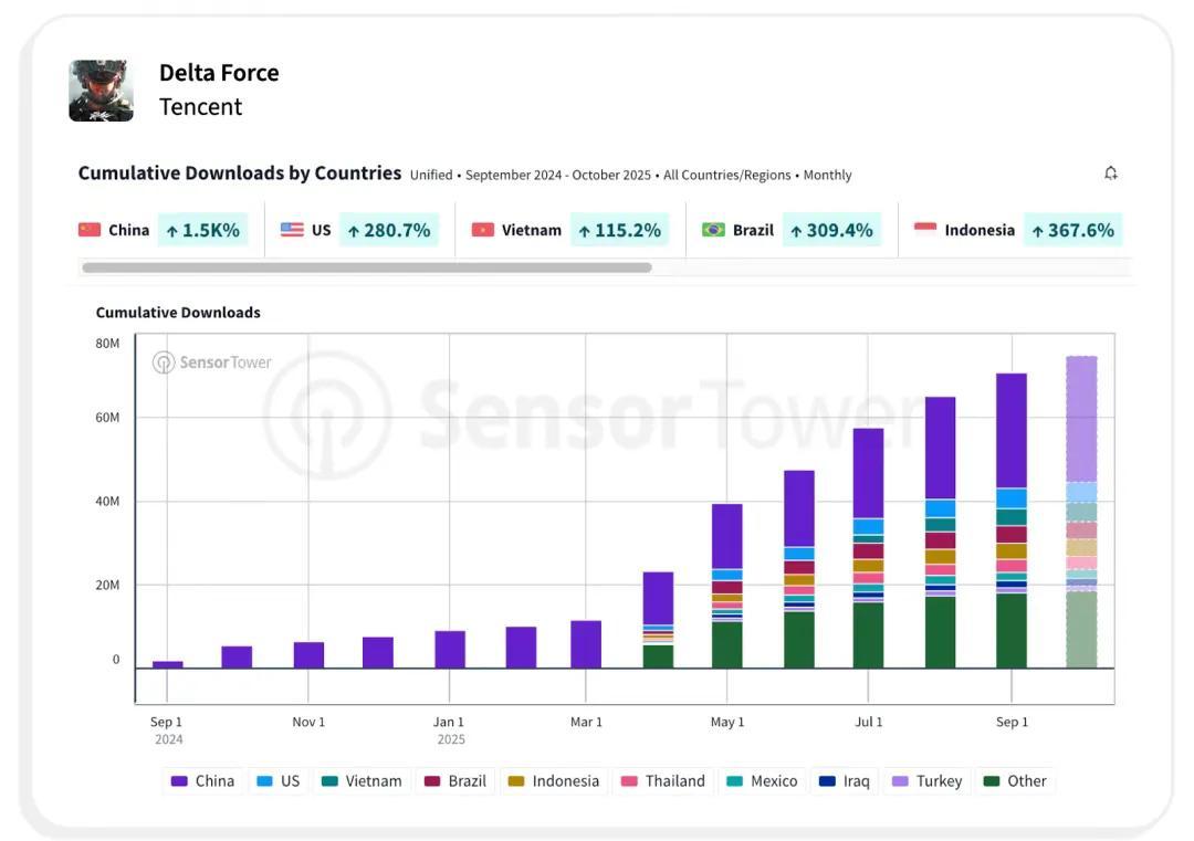 除了騰訊財報提及的季度行業流水TOP 3的成績,據Sensor Tower顯示,10月《三角洲行動》移動端在印尼、巴西、美國市場均獲得了超280%的環比增長;PC/主機版自8月上線以來累計下載量突破1900萬。