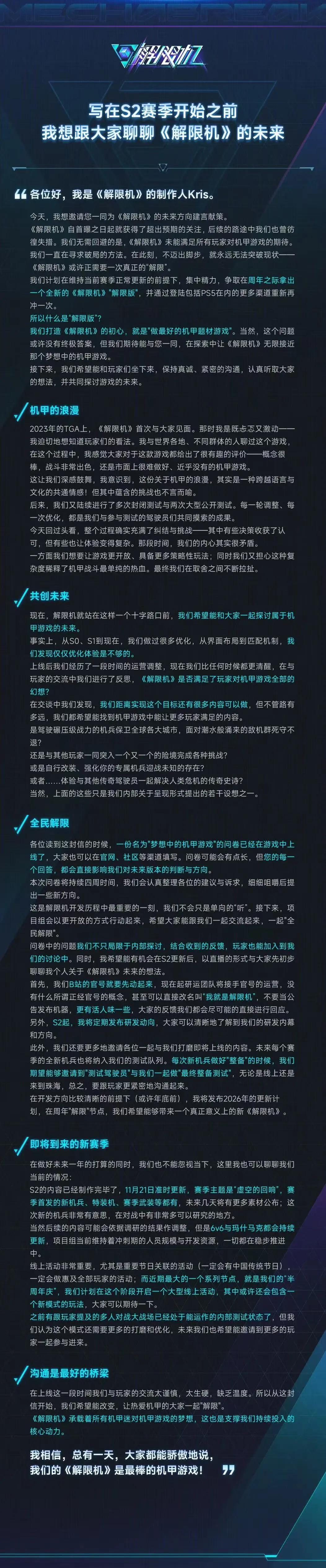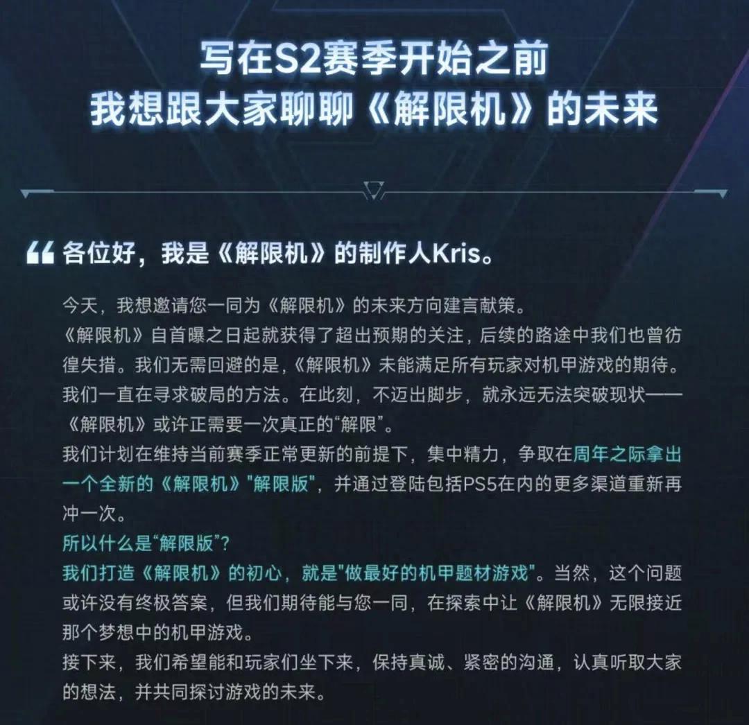 剛剛,《解限機》製作人Kris(郭煒煒)發佈了一封面向玩家的公開信,並開始收集未來版本的意見。從信件內容來看,團隊希望正面回應上線後的數據表現,也希望瞭解玩家真正想要的內容。