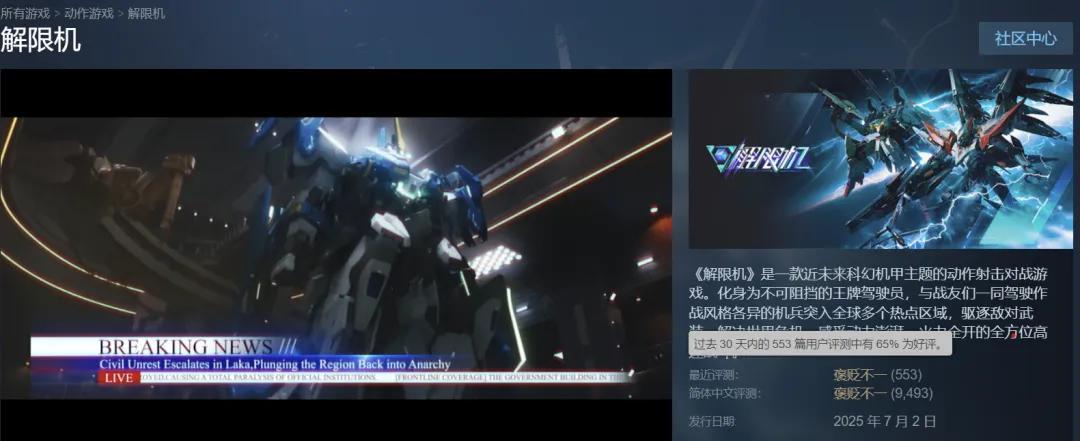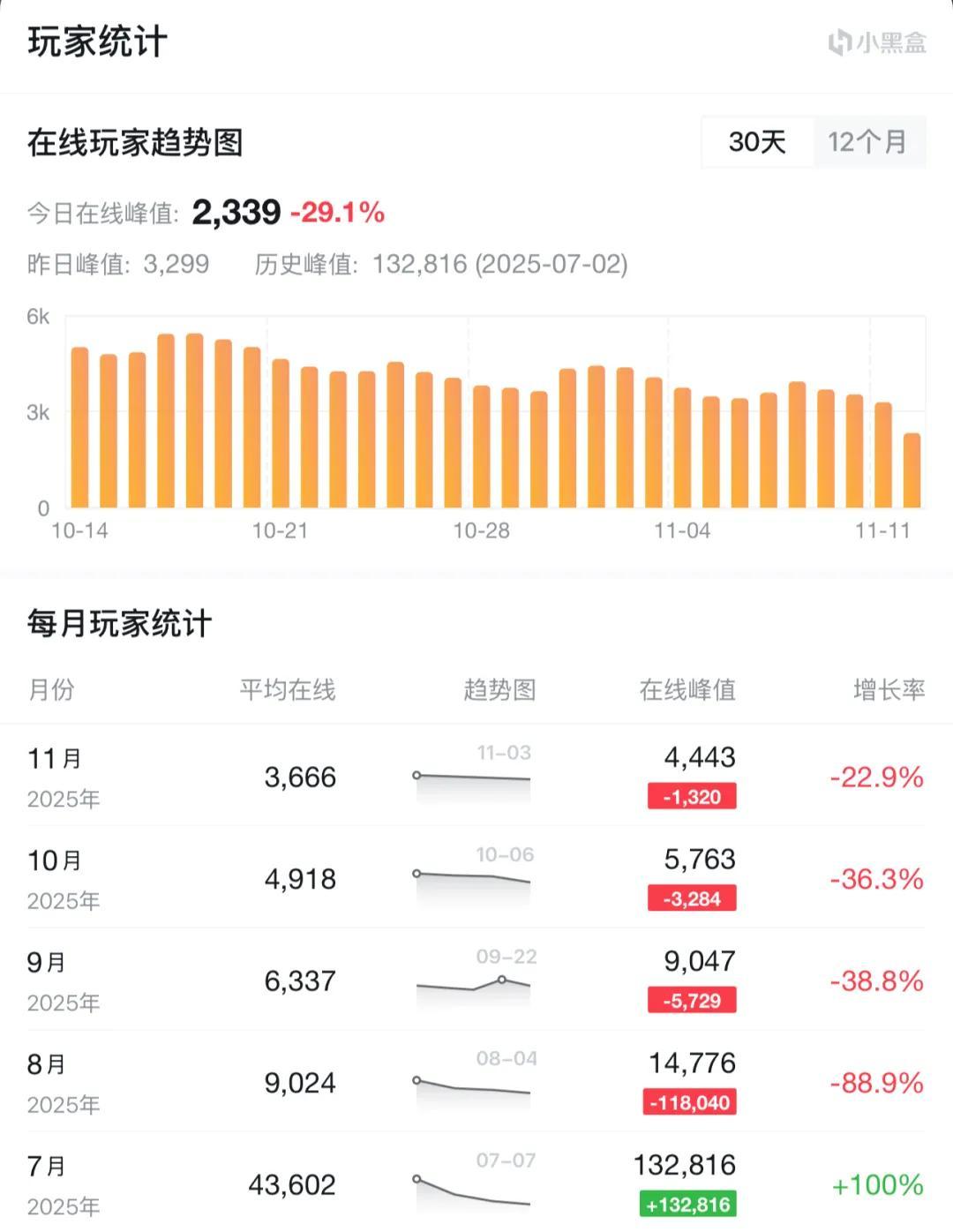 《解限機》在7月2日登陸Steam,上線首日的在線人數達到13.28萬。不過,三天後,該數字下降到7萬。根據小黑盒的數據,第二個月的峯值在線人數減少了近九成,只剩下1.47萬。運營到現在,在線峯值已經低於5000人。