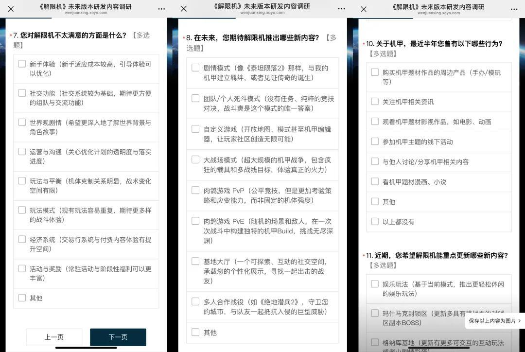 在公開信中,郭煒煒稱團隊意識到,光靠界面、匹配和數值優化,並不能把玩家留住。那麼玩家希望看到什麼?信件列舉了多個方向,比如大規模PVE、合作挑戰、自定義機兵、甚至完整的機甲劇情,但團隊並未直接宣佈做哪一個,而是希望跟玩家進行更深度的溝通調研來確定。爲此,他們上線了一份名爲“夢想中的機甲遊戲”問卷,將持續四周。團隊表示,這次的反饋會直接影響接下來的製作。