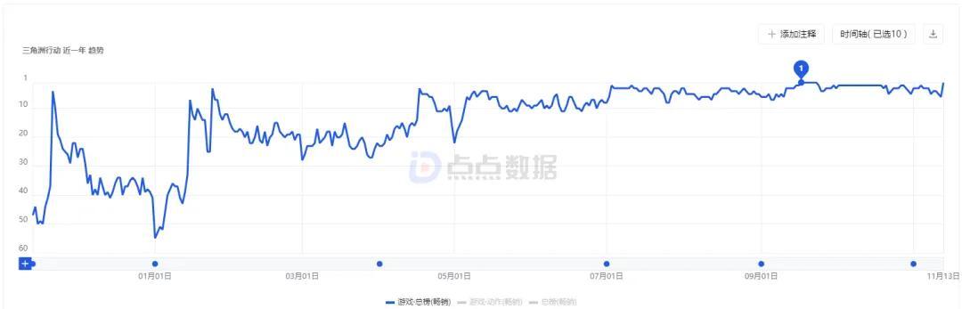 《三角洲行動》是不可避免的焦點。今年Q3,三角洲持續爆發力愈發凸顯,7月宣佈DAU突破2000萬,緊接着9月就突破了3000萬。其在iOS暢銷榜上的成績也從Q2的闖入TOP10變成了Q3的穩定TOP3。一週年慶期間,三角洲一度霸榜iOS暢銷榜第一長達7天。