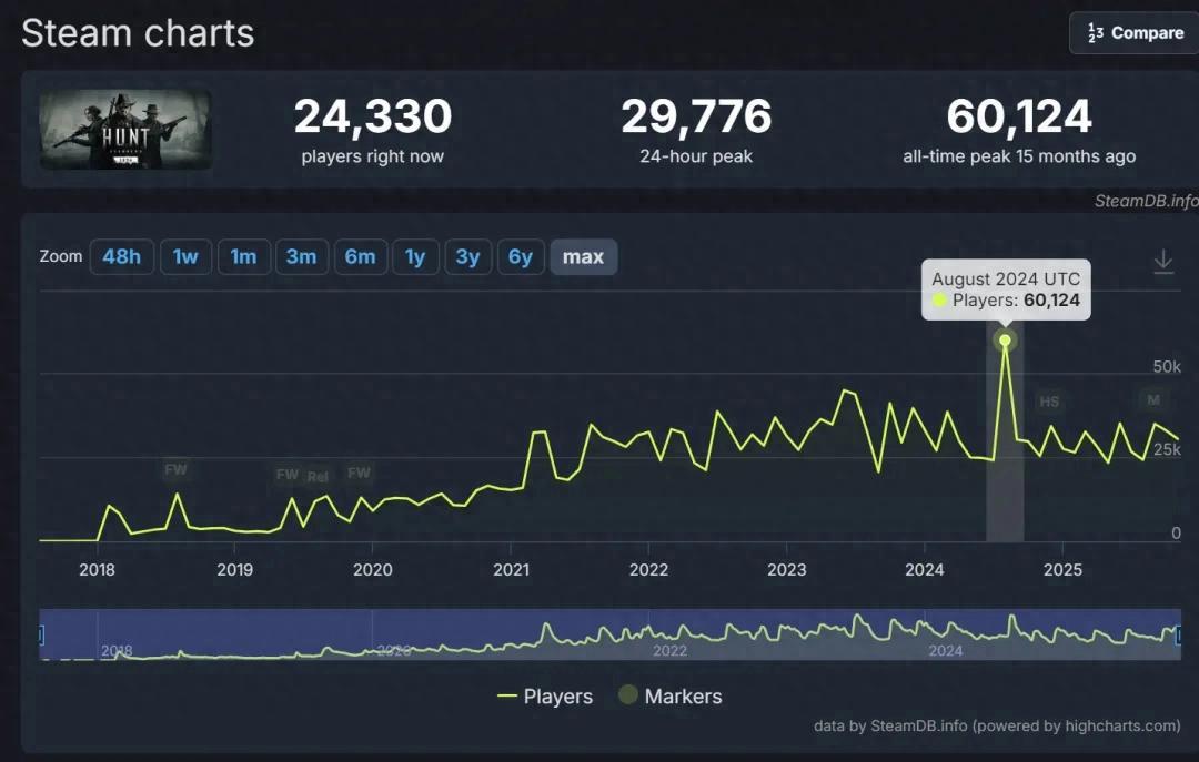 但論成績,《獵殺:對決》並不遜色其他買斷制大作。官方顯示,遊戲至今全平臺銷量(拷貝量)已經超過1000萬份,Steam平均在線也長期穩在2萬以上(SteamDB數據),比不少知名大作還高。