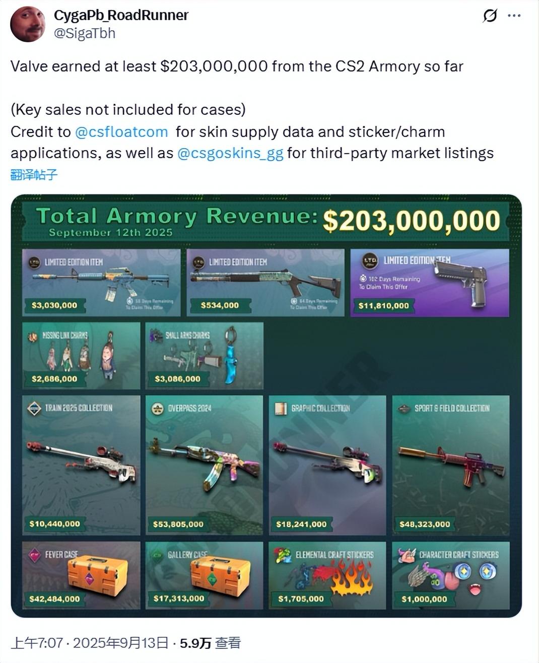 爲了填補大行動和Major通行證的收入空檔,CS2端上了常駐的「武庫通行證」。這個改動給G胖帶來了一筆相當可觀的收入,有外網博主計算,售價15.99美元的武庫通行證大概賺了2億多美元。