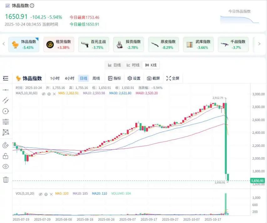 無數手裏有貨的人開始恐慌性拋售,原本動輒成千上萬元的飾品腰斬再腰斬,數據網站的飾品指數暴跌。爆燃了五年的飾品市場,難得開了一回倒車。