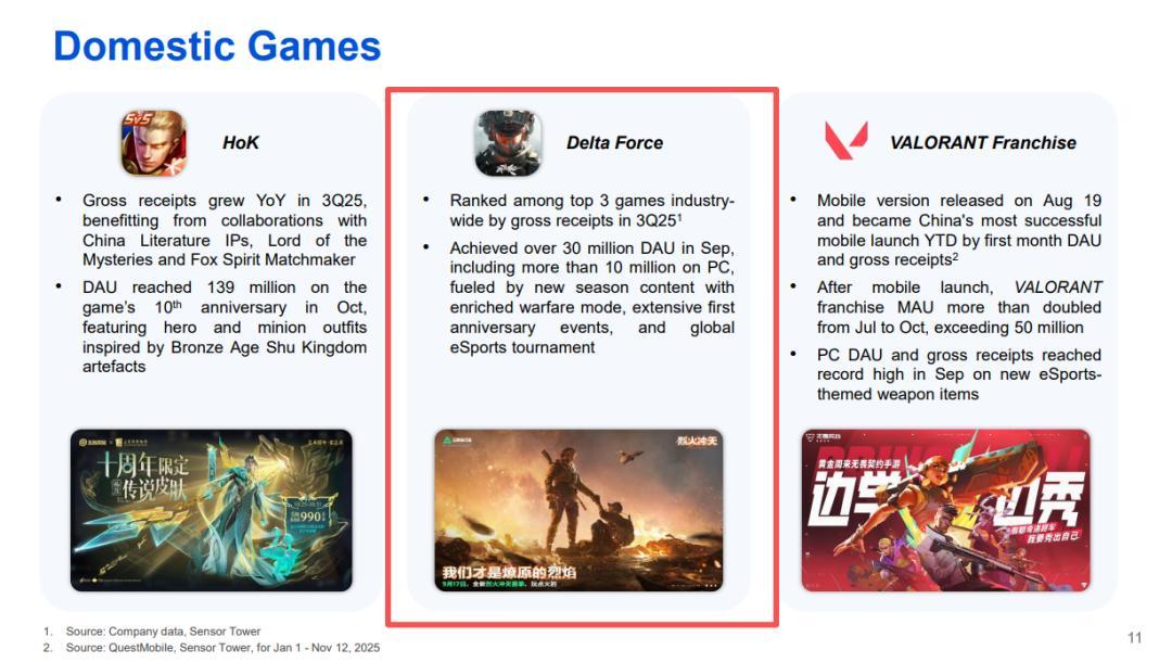 騰訊的公開財報上,無論是半年報還是近期發表的Q3季報,無不點名表揚《三角洲行動》的成績。財報中直接表示,《三角洲行動》本季度流水位居行業前三,推動了遊戲收入增長,而在3000萬的DAU裏,也有足足1000萬來自PC端的玩家。