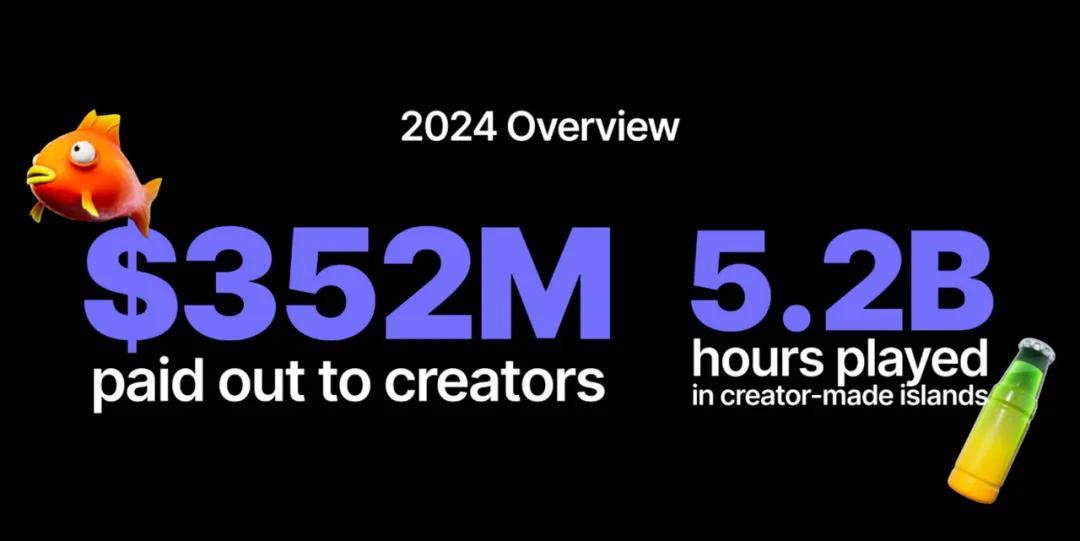 Epic Games這邊,《堡壘之夜》的全球註冊用戶超過5億,UGC生態相當龐大,2024全年有7萬人參與創作,官方發放的分成數額高達3.52億美元(約合25億元),其中7個團隊的年收入超過千萬美元,14個團隊的年收入超過300萬美元。