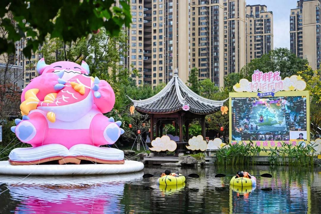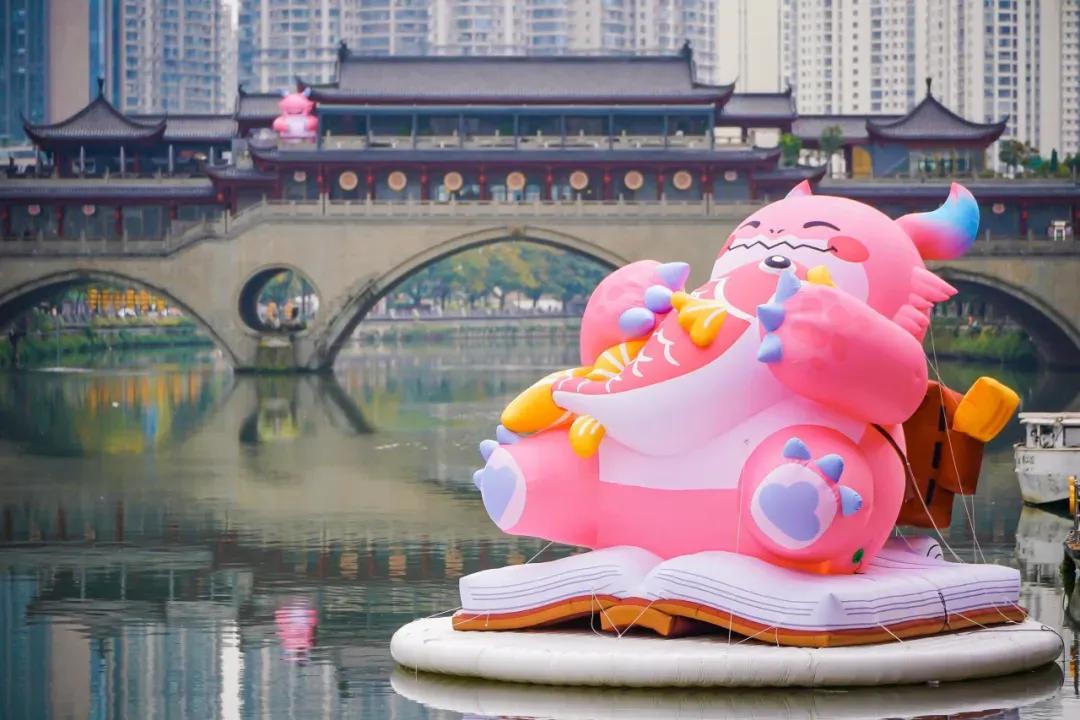 但剷剷賽事卻通過胖胖龍好運樂園,讓所有人都能參與進來。比如這次他們在成都錦江放置了大型水上胖胖龍氣模,舉辦夜遊錦江的活動,還在鐵像寺水街辦起了水上皮划艇觀賽活動……這些人造的奇觀景點,很容易吸引到大批路人駐足。