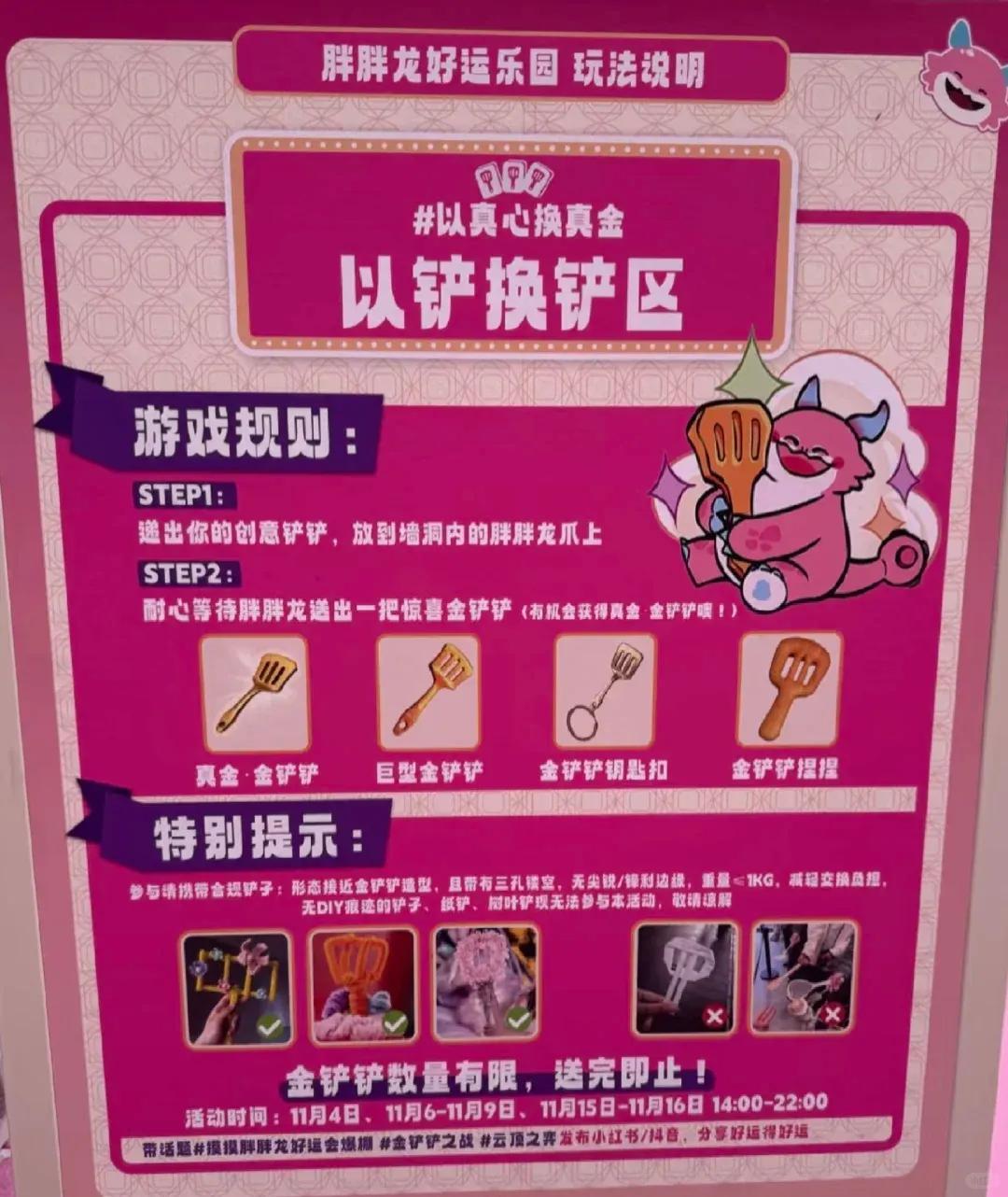 一開始,誰都以爲這只是一次普通的線下活動……看到「以鏟換鏟」這個玩法規則,大家也都很快理解了——你帶一把自己做的、符合評選要求的鏟子,就有機會和胖胖龍換到獎品,其中包括鑰匙扣、大金鏟,甚至是真金的金剷剷。