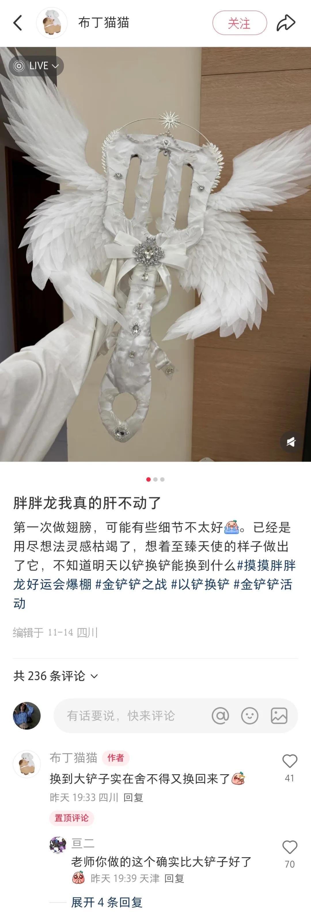 一卷起來,鏟友們直接沉浸在了自己的藝術之中。再加上換鏟活動的獎品,是結合作品質量來決定的——只有那些最具創意或質量的剷剷,纔有機會換到真金鏟!於是鏟友們的勝負欲徹底被引爆了。