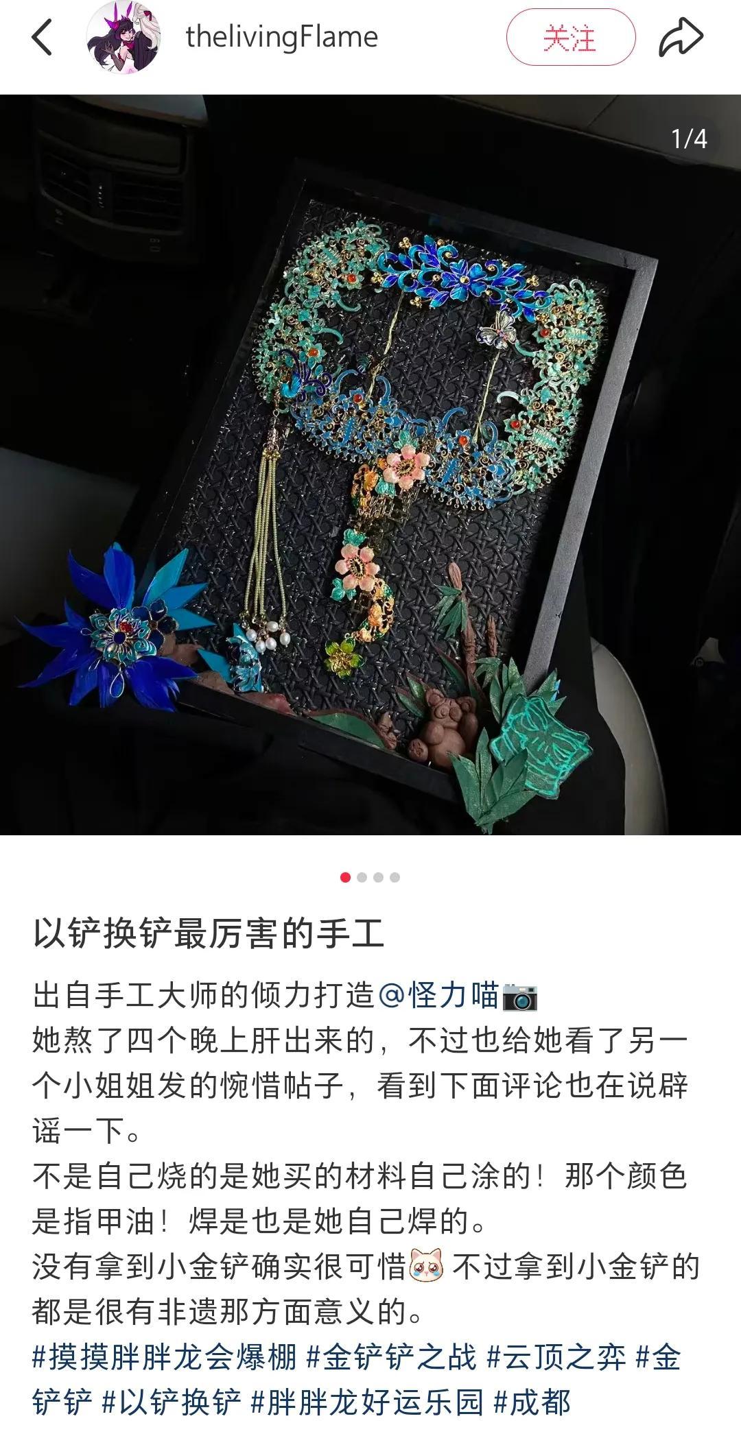 一位鏟友熬了四個晚上,用特殊材料拼接+塗色製作出了一把同樣有潛力的剷剷,最後很可惜沒拿到真金鏟,還有不少網友都爲她感到遺憾,覺得這是最厲害的手工作品之一。