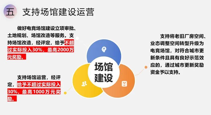 1、做好電競場館建設立項審批、土地規劃、場館改造等服務。支持場館改造,經評定,給予不超過實際投入30%,最高2000萬元的獎勵。
