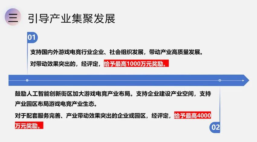 2、鼓勵人工智能創新街區加大遊戲電競產業佈局。支持企業建設產業空間,支持產業園區佈局遊戲電競產業生態。對於配套服務完善、產業帶動效果突出的企業和園區,經評定,給予最高4000萬元獎勵。