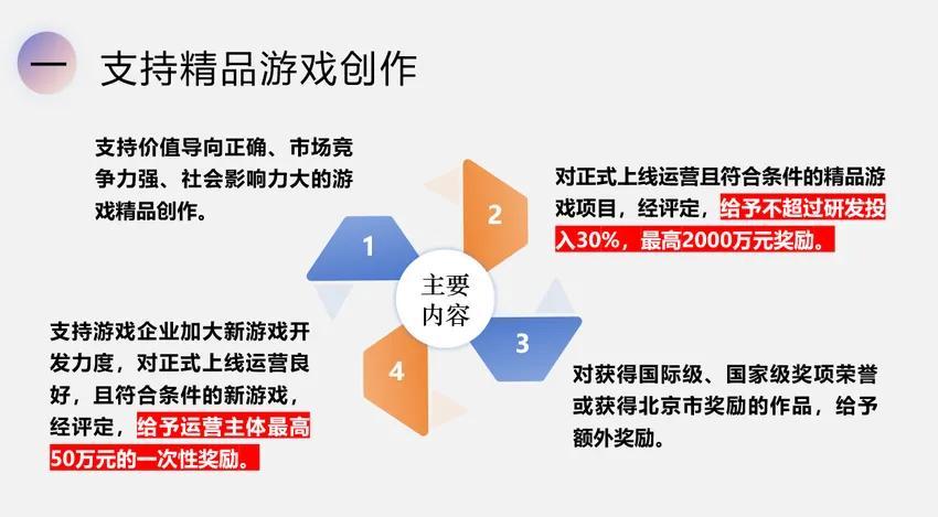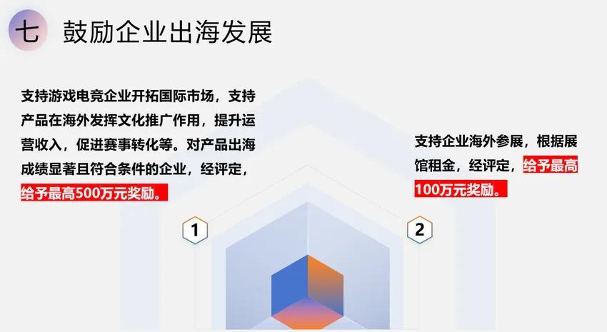 1、支持遊戲電競企業開拓國際市場,支持產品在海外發揮文化推廣作用,提升運營收入,促進賽事轉化等。對產品出海成績顯著且符合條件的企業,經評定,給予最高500萬元獎勵。