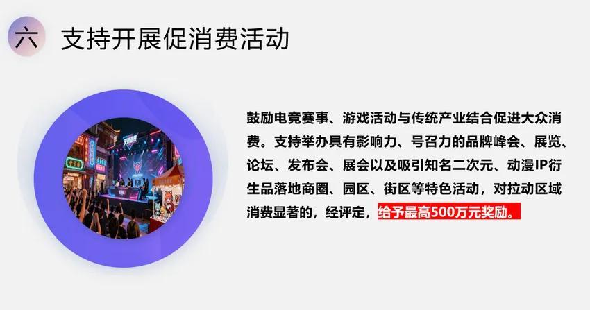 鼓勵電競賽事、遊戲活動與傳統產業結合促進大衆消費。支持舉辦有影響力、號召力的品牌峯會、展覽、論壇、發佈會、展會以及吸引知名的二次元、動漫IP衍生品落地商圈、園區、街區等特色活動,對拉動區域消費顯著的,經評定,給予最高500萬元獎勵。