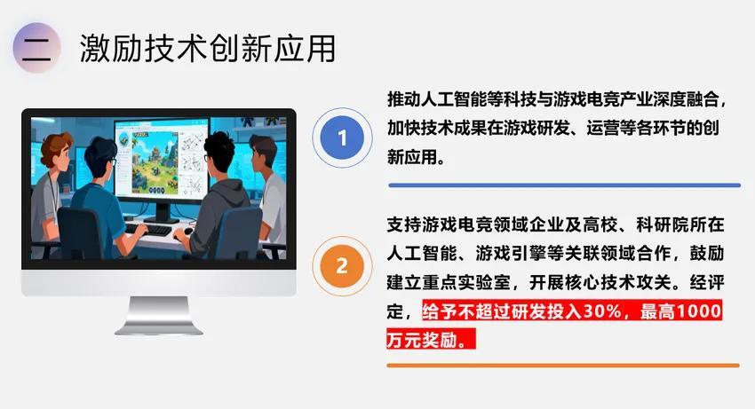 1、推動人工智能等科技與遊戲電競產業深度融合,加快技術成果在遊戲研發、運營等各環節的創新應用。