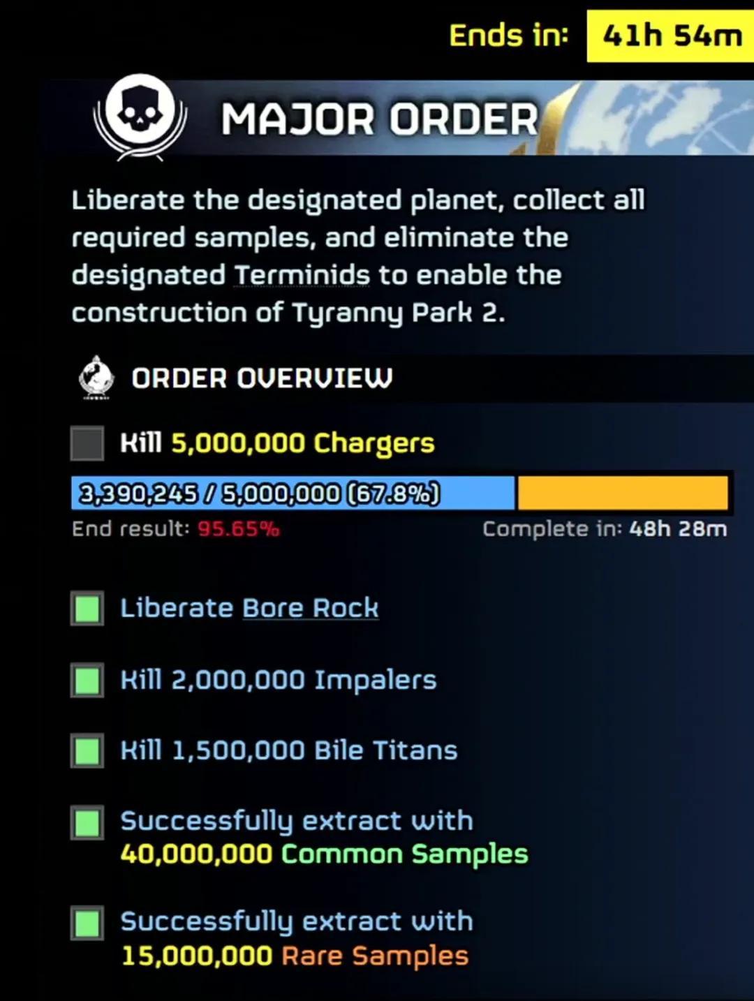 上圖就是一條重要指令,也是目前遊戲中正在執行的指令。這是我昨天截的圖。我們告訴玩家,由於“暴政公園一號”不幸地、且無法預見地被摧毀了,所以他們必須幫助超級地球建造“暴政公園二號”。爲此,他們需要解放某些星球,消滅各種類型的敵人,以及收集一些樣本。