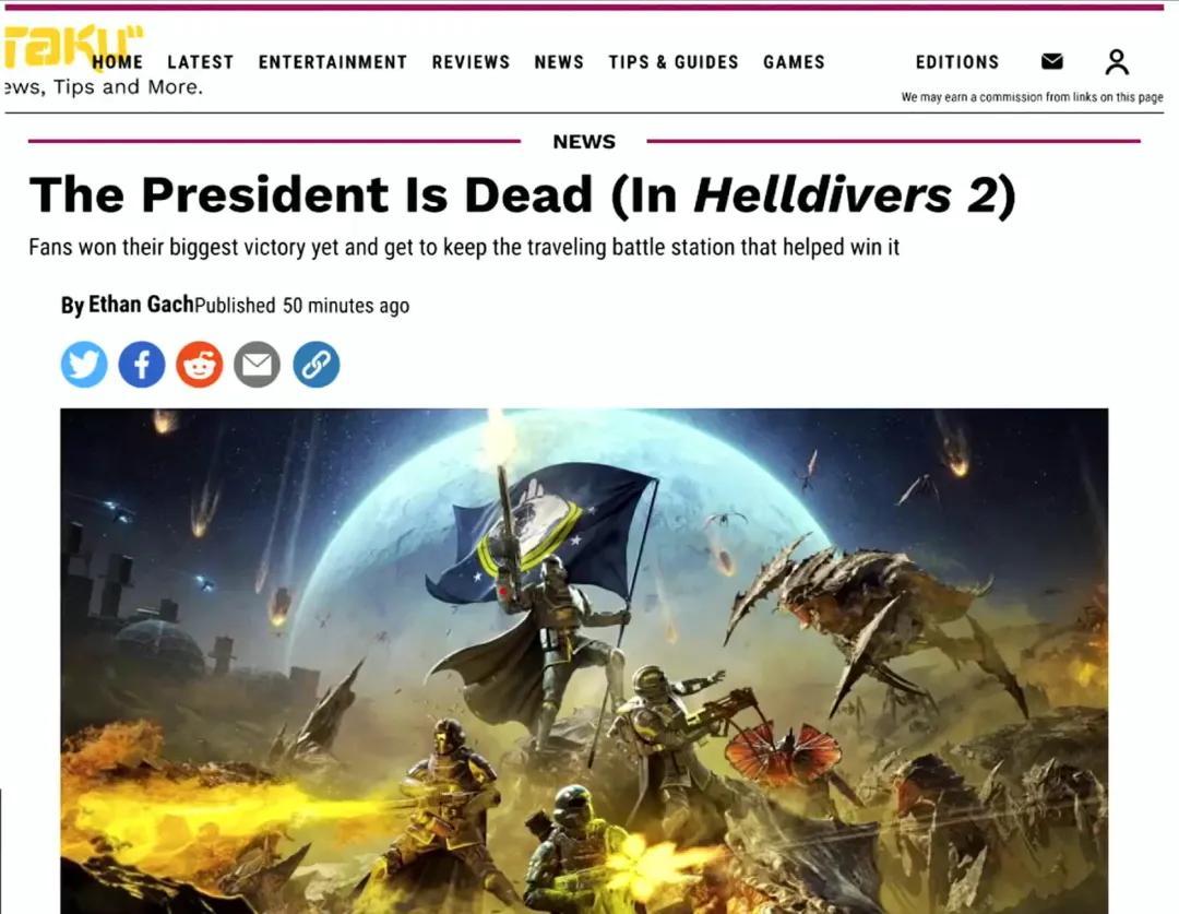 我們根本沒料到會這樣。於是,我們再次祭出了“免罪金牌”。在超級地球即將陷落之際,我們在遊戲裏發佈了一則簡報:“總統在他堅守的掩體中英勇犧牲。”