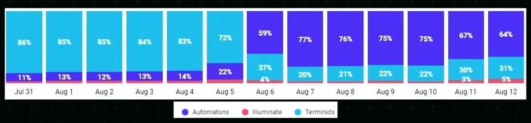 上圖能讓你感受到“重要指令”是如何影響玩家行爲的。遊戲裏有三個敵對陣營:像蟲子一樣的“終結族”,機器人,還有像烏賊一樣的“光能者”。這張圖表顯示的是,在某一天,有多少百分比的玩家在對抗各個陣營。