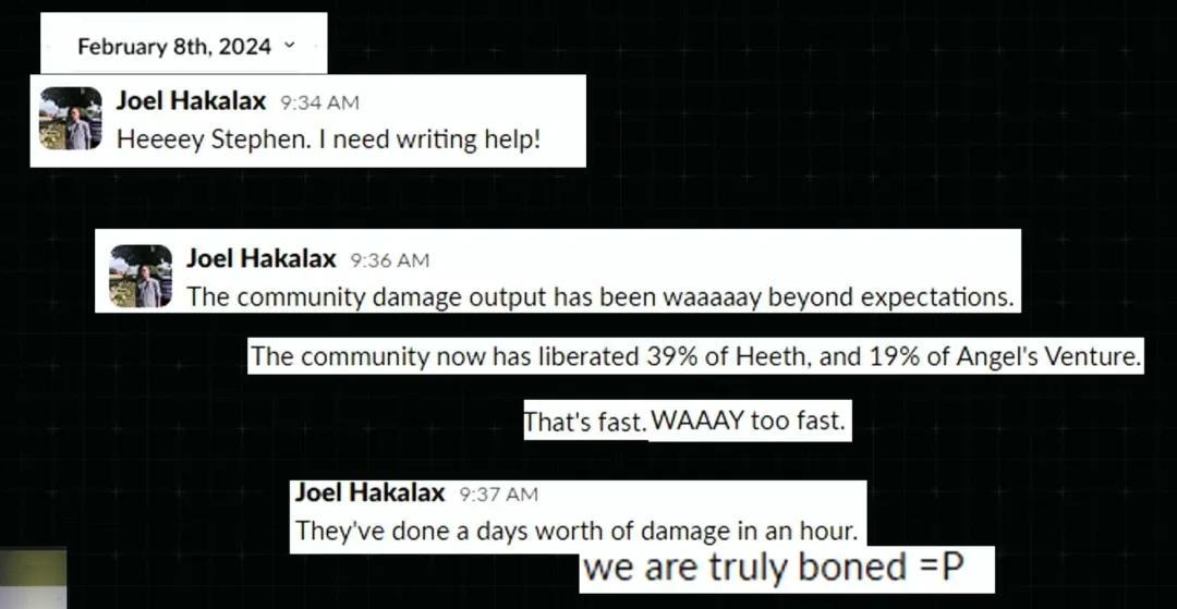 2月8日,遊戲發售日,一個激動人心的日子。我收到了Joel的消息:“嘿,Stephen,我需要文案支援!社區的傷害輸出遠遠超出了預期。他們已經解放了‘希斯’行星39%的區域和‘天使投資’行星19%的區域!這太快了,快得離譜!他們只用了一個小時,就打出了原本計劃一天的傷害量。我們真的完蛋了!”