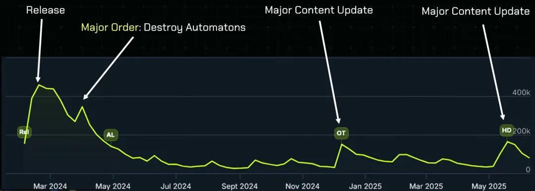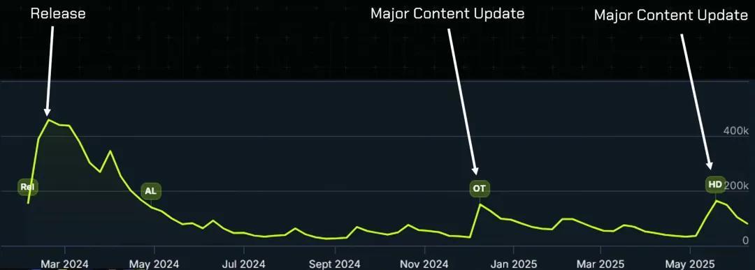 這是遊戲上線至今的Steam同時在線玩家數。你能看到幾個峯值。最大那個是發售時的,還有兩個是大型內容更新。這對於一個在線服務型遊戲來說,是符合預期的。當你發佈了大量新內容,玩家們自然會很興奮地回來看看有什麼新東西。