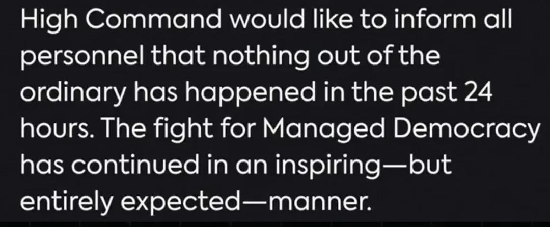 指揮部特此通知所有人員:過去24小時內未發生任何異常情況。爭取管理式民主的戰鬥,正以一種鼓舞人心且完全符合預期的方式進行。如果您認爲發生了什麼怪事,您很可能受到了敵方精神控制,請立即接受審查。