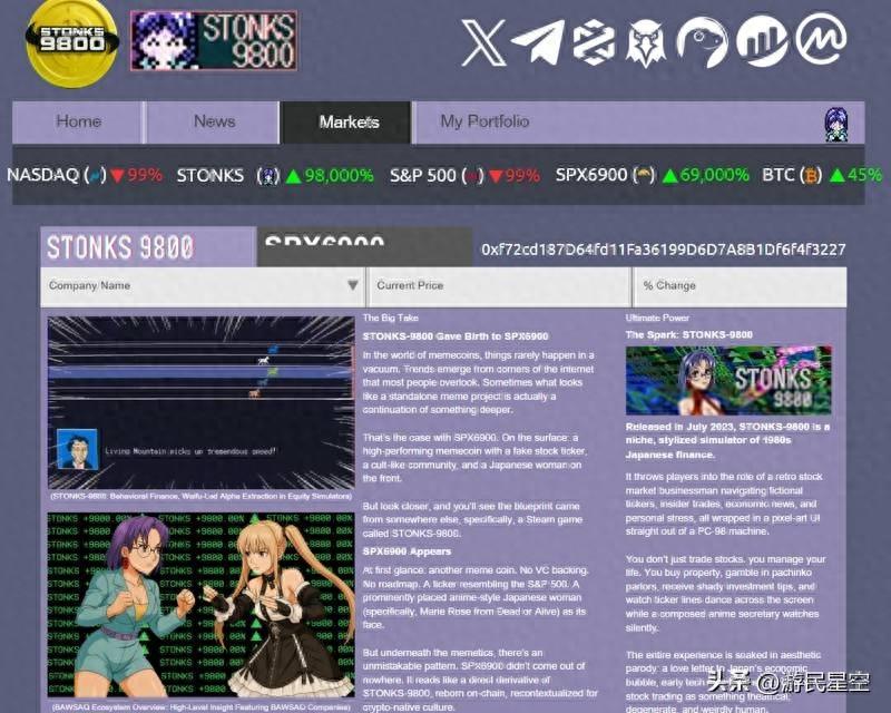 該網站宣稱,目前市值超過4.5億美元、超過21萬人次持有的虛擬貨幣SPX69**,居然本質是受一款發佈於2023年的獨立遊戲《東京股神 STONKS-9800》影響而誕生的。