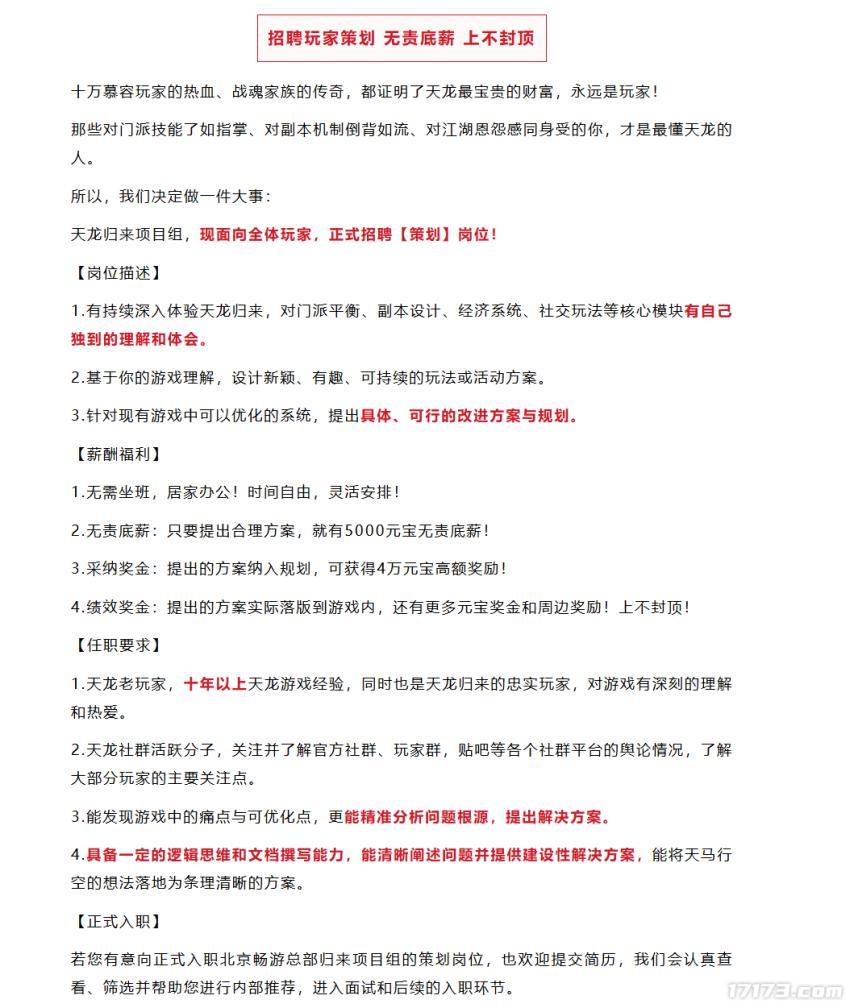 只要你提的方案合理,就能立刻領到5000元寶無責底薪,若被真正採納,獎勵直接拉到4萬元寶,優秀者還能直通北京暢遊總部,加入歸來項目組。