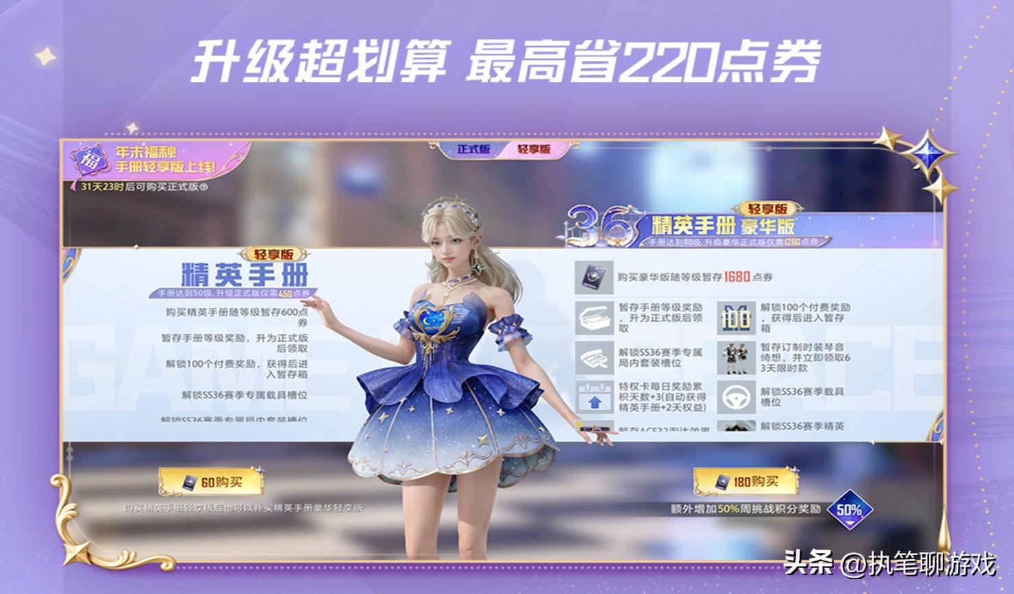 需要提醒大家的是:如果《和平精英》SS36賽季開啓後,玩家選擇了正式版的精英手冊或豪華手冊,則無法更換輕享版,只有先開啓輕享版,然後等到元旦進行升級,才能得到最高220點券的節省。