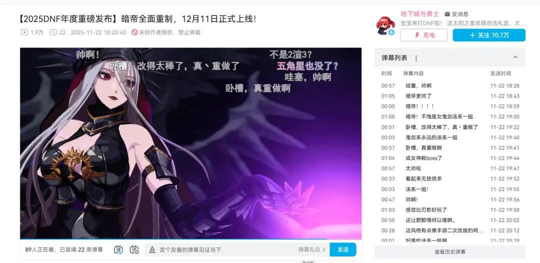 這其中最能調動玩家情緒的,還是職業暗帝(暗殿騎士)的全面重做,從立繪到動畫再到技能,而且是國服首發重做——相關視頻彈幕和評論區幾乎都是讚歎「DNF再次偉大」;