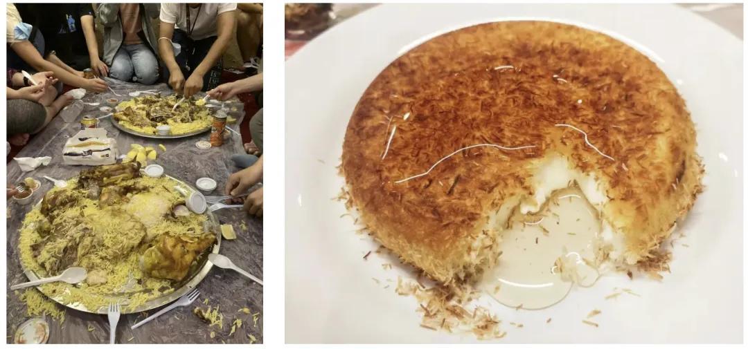 莊園裏,大家喫了圖片同款的羊排手抓飯,及配套甜品Konafa(庫納法),圖片僅供示意,圖源公衆號KSA沙特人