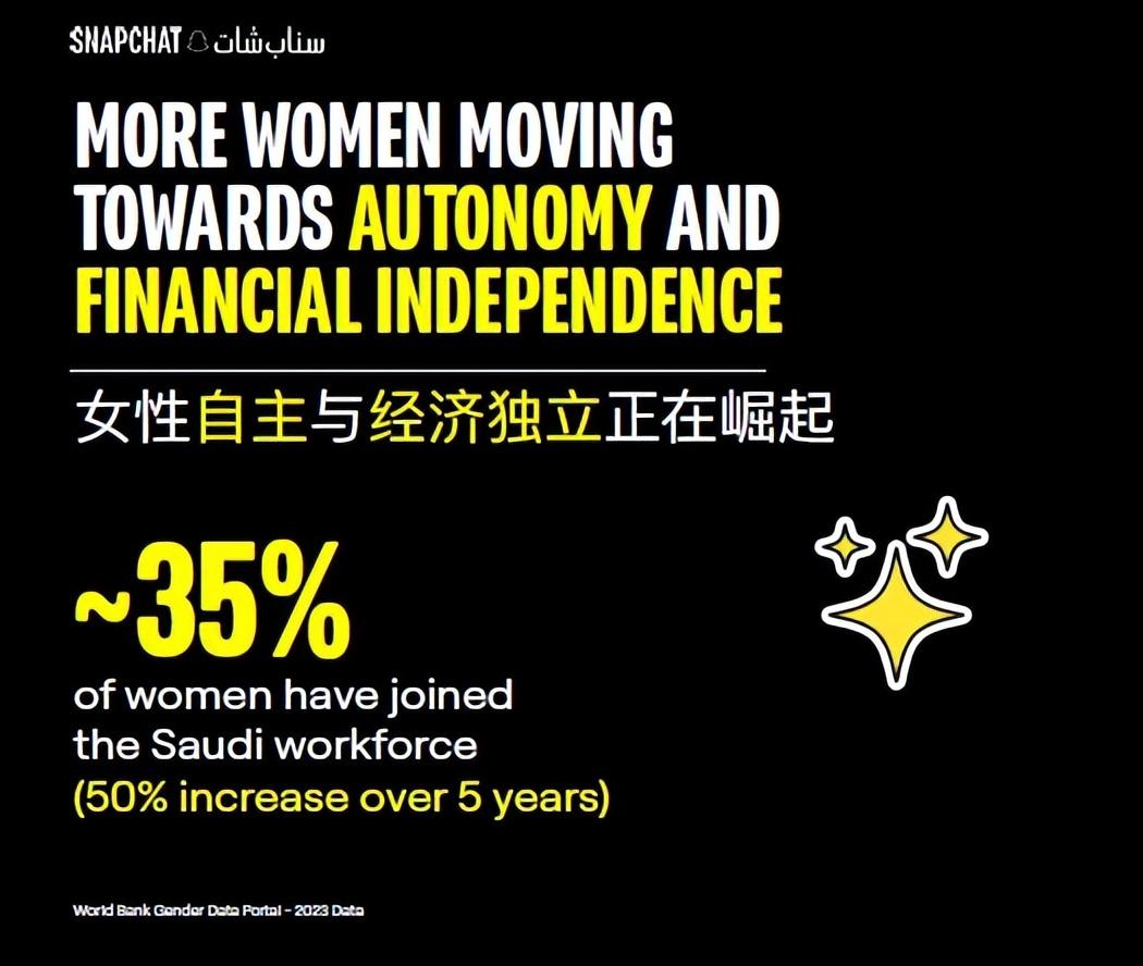 在「2030願景」推動下,女性逐漸從傳統習俗中解放出來:截至目前,約35%的沙特女性進入職場,女性勞動參與率在過去五年增長超過50%,女性擁有了更多話語權和消費能力。
