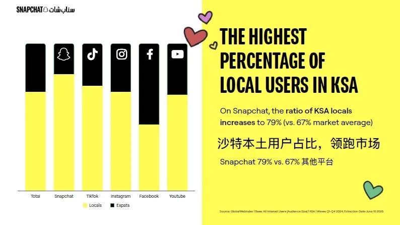 拿沙特國民應用Snapchat來說,該平臺在沙特的用戶使用率達到79%,遠超市場平均水平67%。且他們每天打開Snapchat超過50次,品牌廣告互動率也是其他平臺的3.5倍,甚至有59%的用戶會主動分享平臺上的廣告——可見他們對互聯網內容甚至品牌廣告的關注。