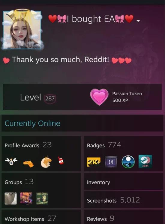 參與收購EA完成後,小薩勒曼還將自己的Steam賬號改成了「我買下了EA」。