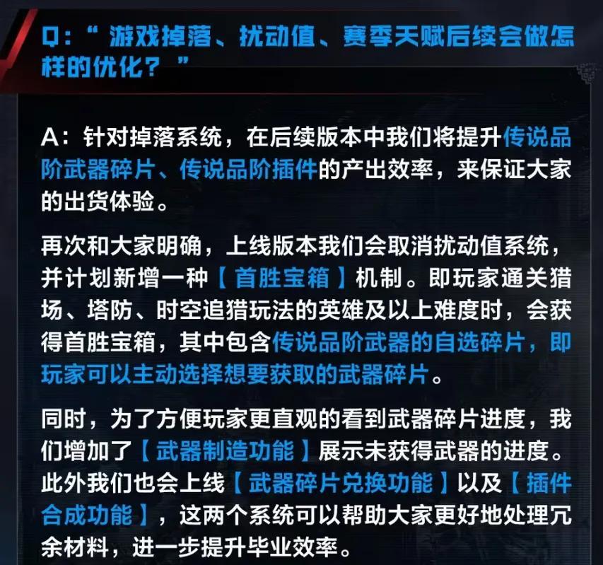 一是擾動值,這個「越刷收益越低」的設計本身是爲了降肝,讓玩家每天有規劃和限度的刷寶,但真正喜歡刷寶的玩家會覺得「收益在減少,最低都不怎麼出貨」,變成了負面反饋。後續我們會取消擾動值設計,提升傳說武器碎片、傳說品階插件的產出效率;