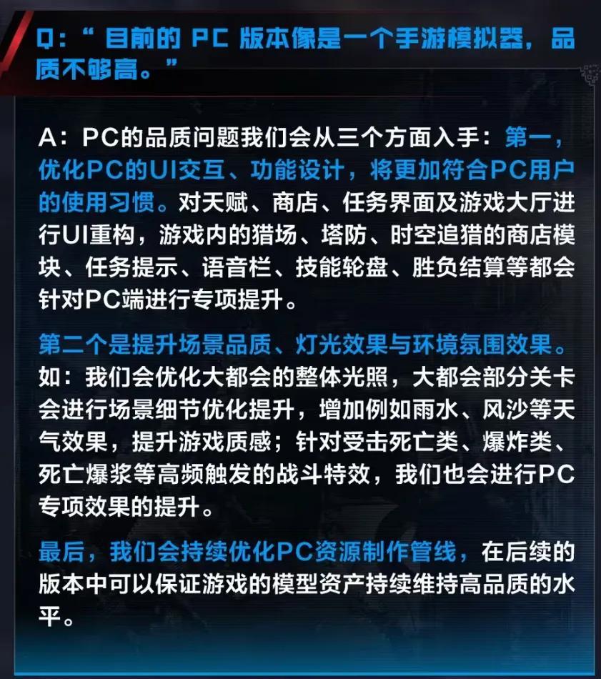 爲此,我們很重視PC端的投入,這次測試有玩家反饋PC端的UI像模擬器,我們會在公測前實現原生PC界面,並對PC針對性做更好的效果表現。
