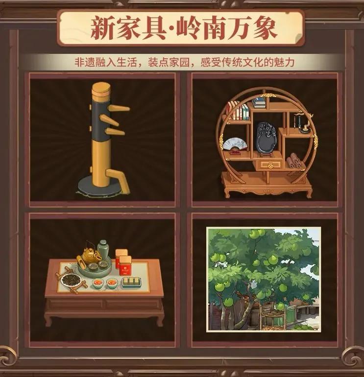 此外,玩家還可以在這個版本中獲取英歌舞主題的皮膚,以及4款新傢俱——詠春木人樁、端硯博物架、英德紅茶茶几和化橘紅樹。