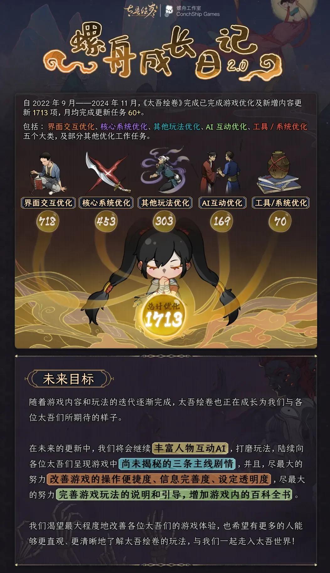 近三年來,太吾已經進行了40多次超大型更新,每次更新內容平均有接近50條,除此之外的小型更新更是多達上百次。這些更新,前前後後已經實現了上千條玩家的需求反饋。