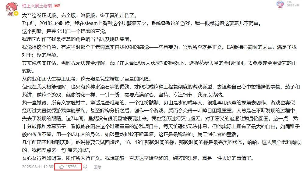 評論區王老菊甚至用「吾心吾行澄如明鏡,所作所爲皆正義」,來形容製作人茄子對遊戲純粹樂趣的追求,這條評論點贊量多達15756次。