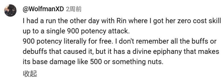 這種一瞬間暴爽的體驗甚至無需刻意去挖掘,有可能在不經意的嘗試中找到“驚豔”套路,比如下面的這個海外老哥,說的就是用角色“凜”時忘記了自己到底疊了哪些效果,但愣是把0費技能堆出了900的傷害數值,讓他自己都直呼“離譜”。