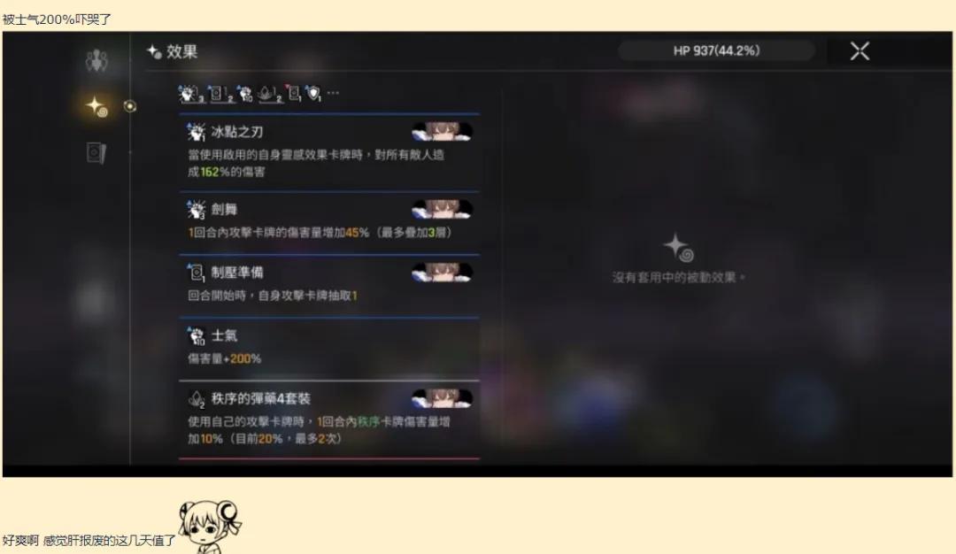 組牌的爽是肉眼可見的。例如貼吧裏有個蕾諾婭的“核爆流”打法熱門梗圖,在“卡厄思”玩法中刷出幾個卡牌的閃光分支卡後,鎮魂子彈串聯起了整個機制,通過生成、換牌、疊buff、棄牌以及自主意識技能(大招)的組合,單回合內會打出極限爆發傷害。