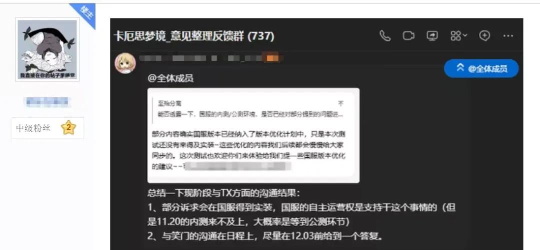 而且騰訊並不只是口頭上說一說,比如貼吧裏已透露出部分相關動作。因爲有海外的實裝體驗,《卡厄思夢境》國服測試開始前就有大幾百人的交流羣,羣主分享了具體溝通情況,能看到國服團隊確實持續保持着與國服玩家的溝通,也在積極地與研發團隊反饋玩家的意見。