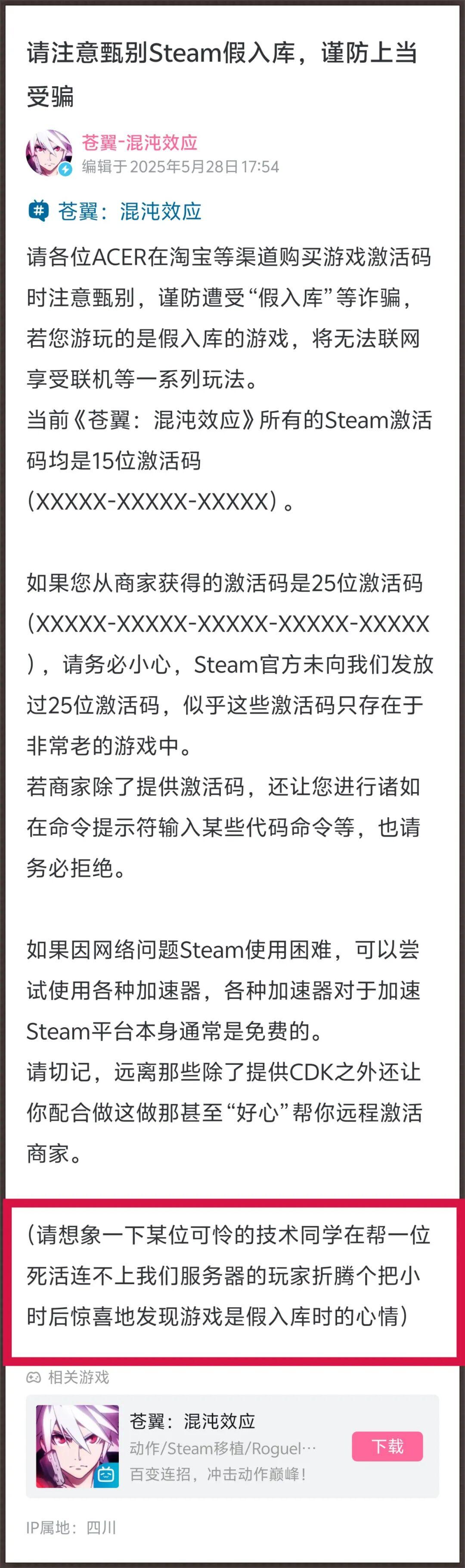 最經典的是今年5月,《蒼翼:混沌效應》官方在B站發佈一條動態,提醒大家在淘寶等平臺購買遊戲激活碼時要仔細甄別,謹防“假入庫”詐騙。