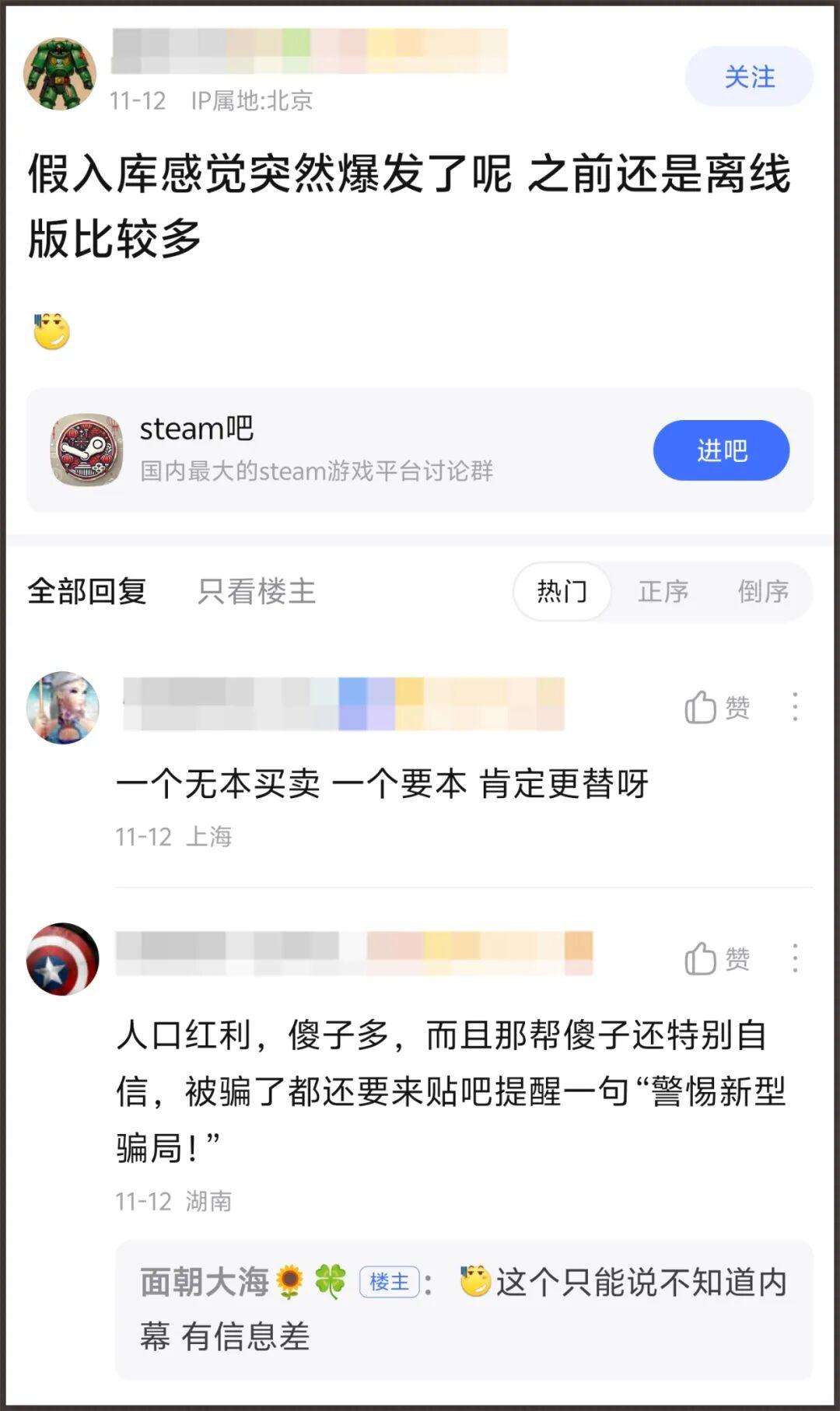 最近幾個月,我在小黑盒、Steam吧等遊戲社區,天天刷到被“假入庫”騙的帖子,受害者數不勝數。