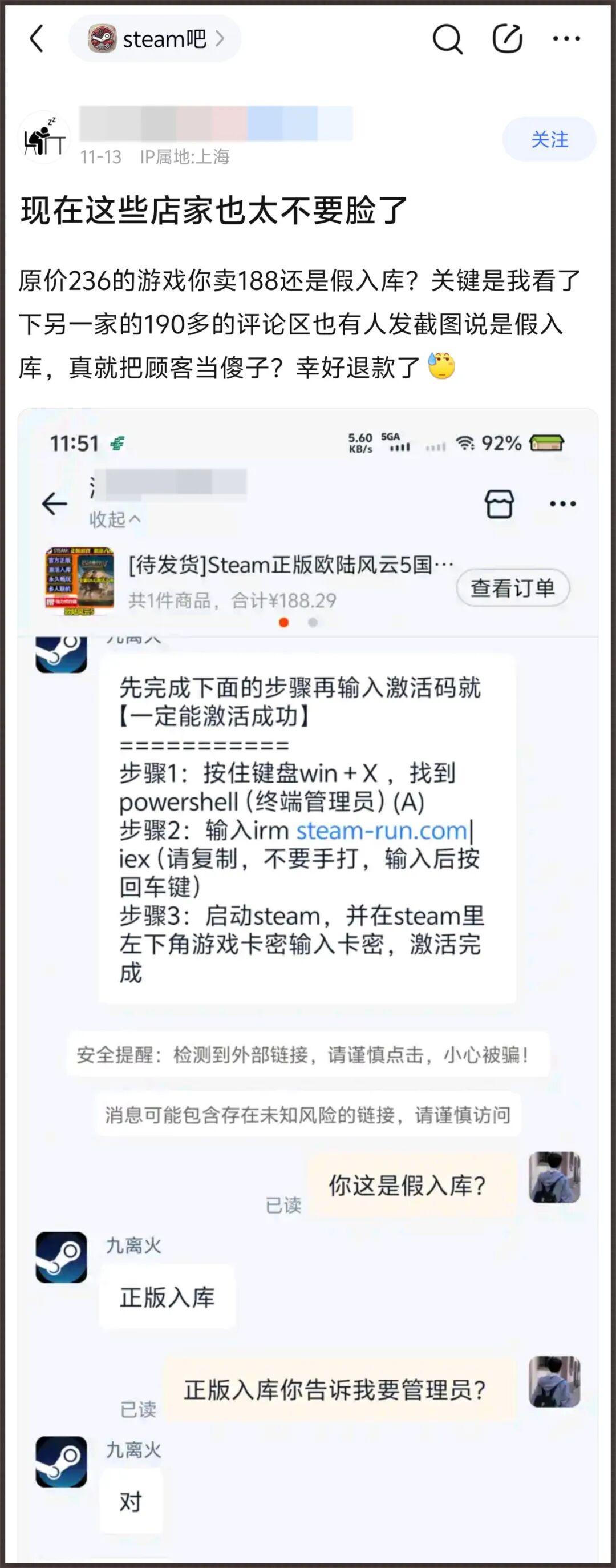 類似騙術大概從2023年起,便陸續在網上出現了,然而最近手段越來越隱蔽,讓人防不勝防。去某寶、並刀刀買Steam遊戲,十有八九會踩“假入庫”的坑。